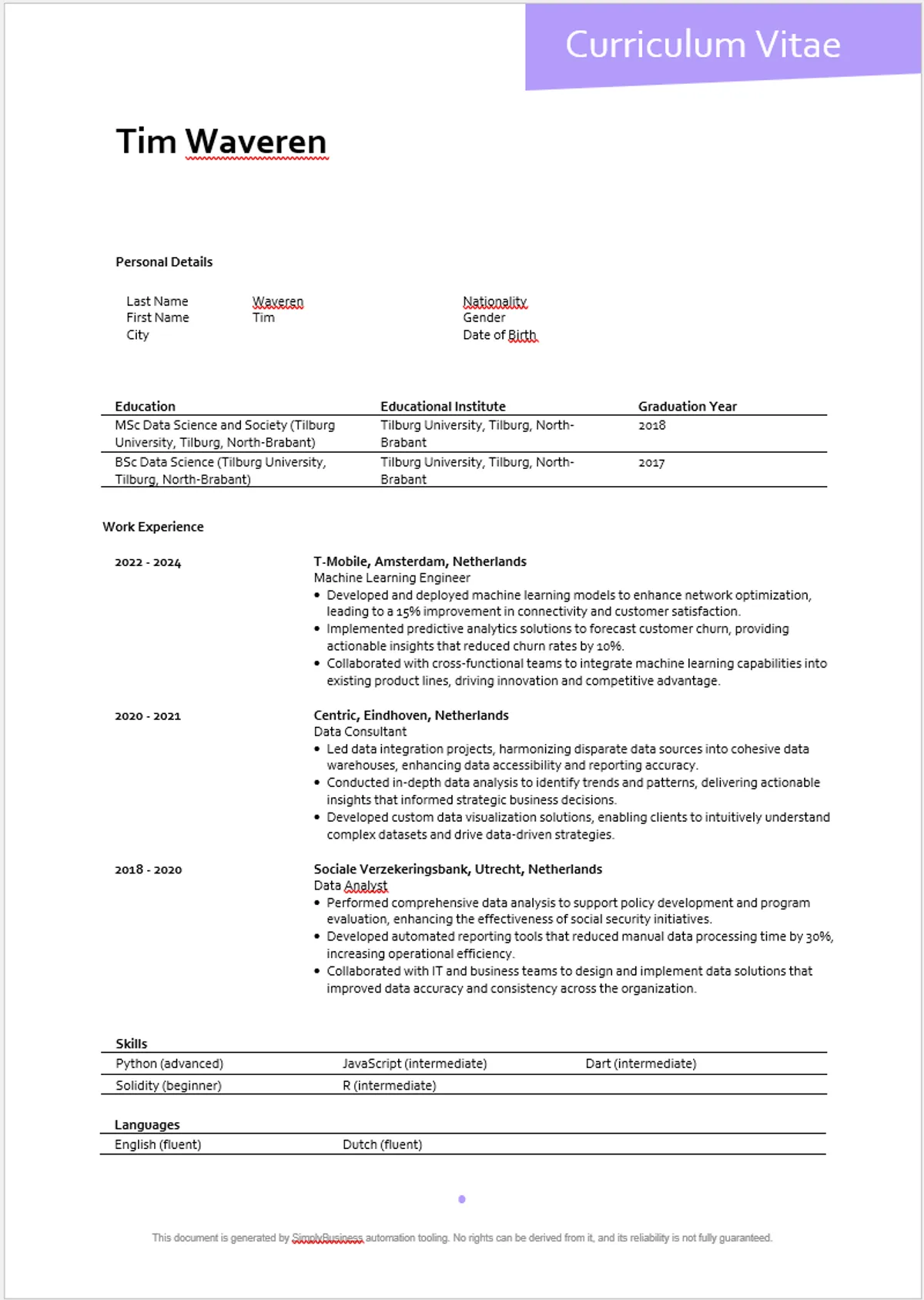 But there's more. CV formatting converts the complete CV to your own house style. Font, layout, structure, color scheme. Everything according to your template. Including grammar correction. The candidate wrote 'managment'? Simply corrects it. Without you having to open Word.