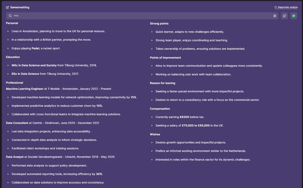Energetic summaries adapt to the conversation type. A candidate intake produces a structured profile. Work experience, competencies, availability, salary expectations, motivation, red flags. All neatly structured.