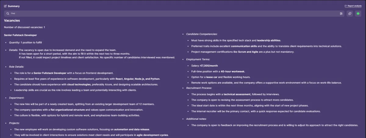Everything is transparent. Every sentence in a summary is clickable. Click it and hear the exact moment in the conversation. Read the transcript. No black box. Full control. This is non-negotiable when it comes to candidate data.
