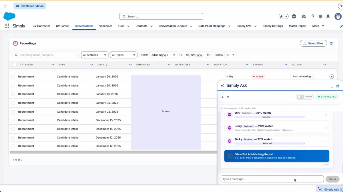 Simply Ask is precies dat. Je typt: "Ik heb net een vacature geüpload, wie is de beste match?" En de AI doorzoekt al je kandidaten, rankt ze op basis van zes criteria, en geeft je een top 5 terug. Met uitleg per criterium.